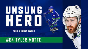 Tyler Motte was also the winner of the Daniel and Henrik Sedin Award for community leadership, introduced in 2019.20, for his role as the Canucks Hockey Talks ambassador for mental health advocacy.
