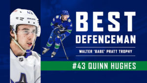 For the second straight year, Quinn Hughes won the fan vote for the Walter (Babe) Pratt Trophy as the club’s “Best Defenceman.”