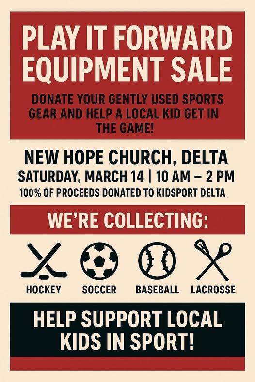 There will be a sale upcoming next spring in North Delta Saturday March 14th from 10 -2 held at the New Hope Church so make the date on your calendar and put it in your planner so you don’t miss out with all donations and funds raised going to Kids Sport Delta.