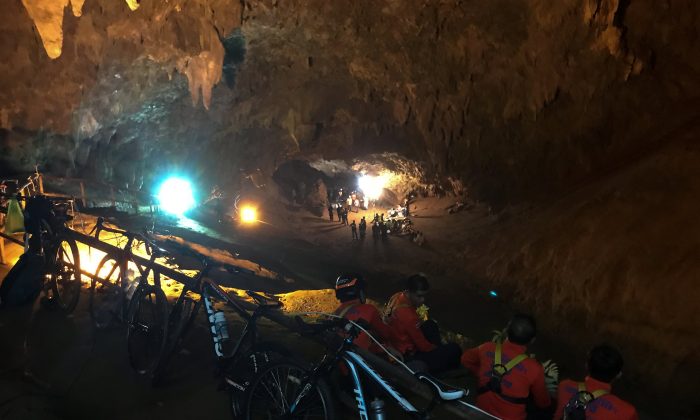 Rescue divers reached several kilometres inside a flooded cave on June 30 where 12 boys and their football coach have been trapped for a week, offering a flicker of hope for the harrowing search. / AFP PHOTO / Lillian SUWANRUMPHA